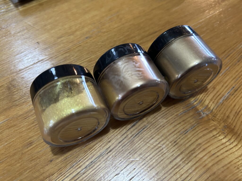 見た目はグレー(黒と白を混ぜると灰色になる)なので、最後に接着剤+金粉でカバーする必要があります。