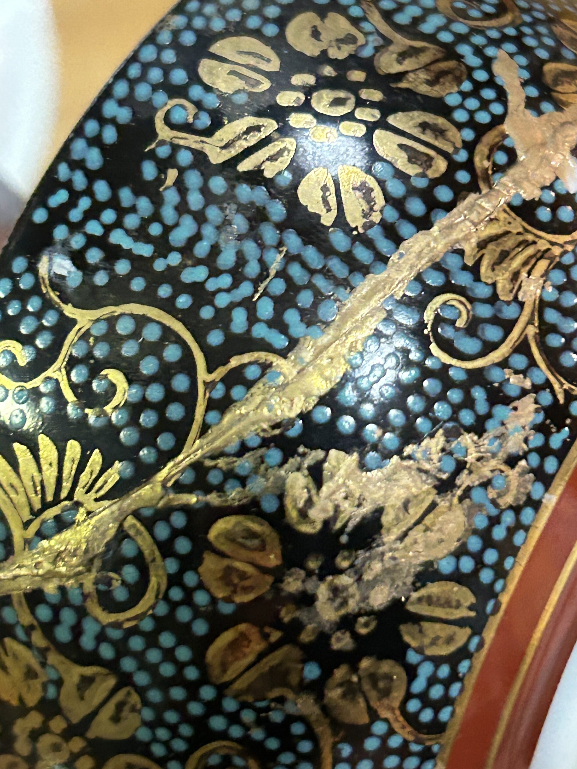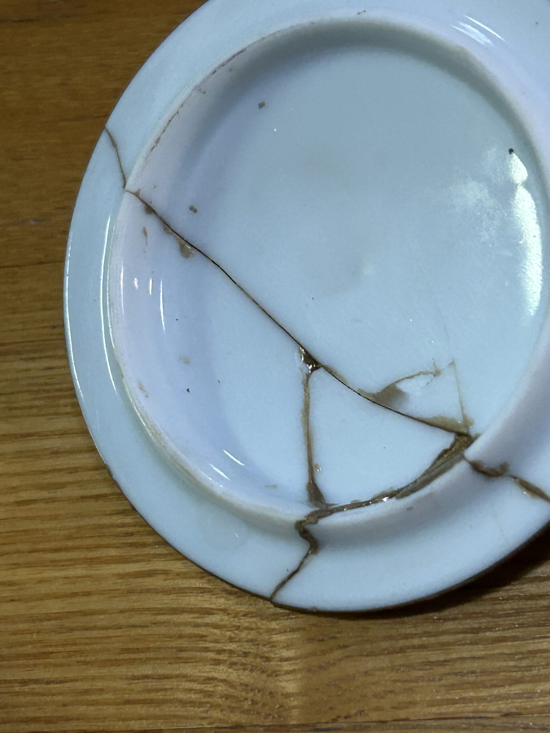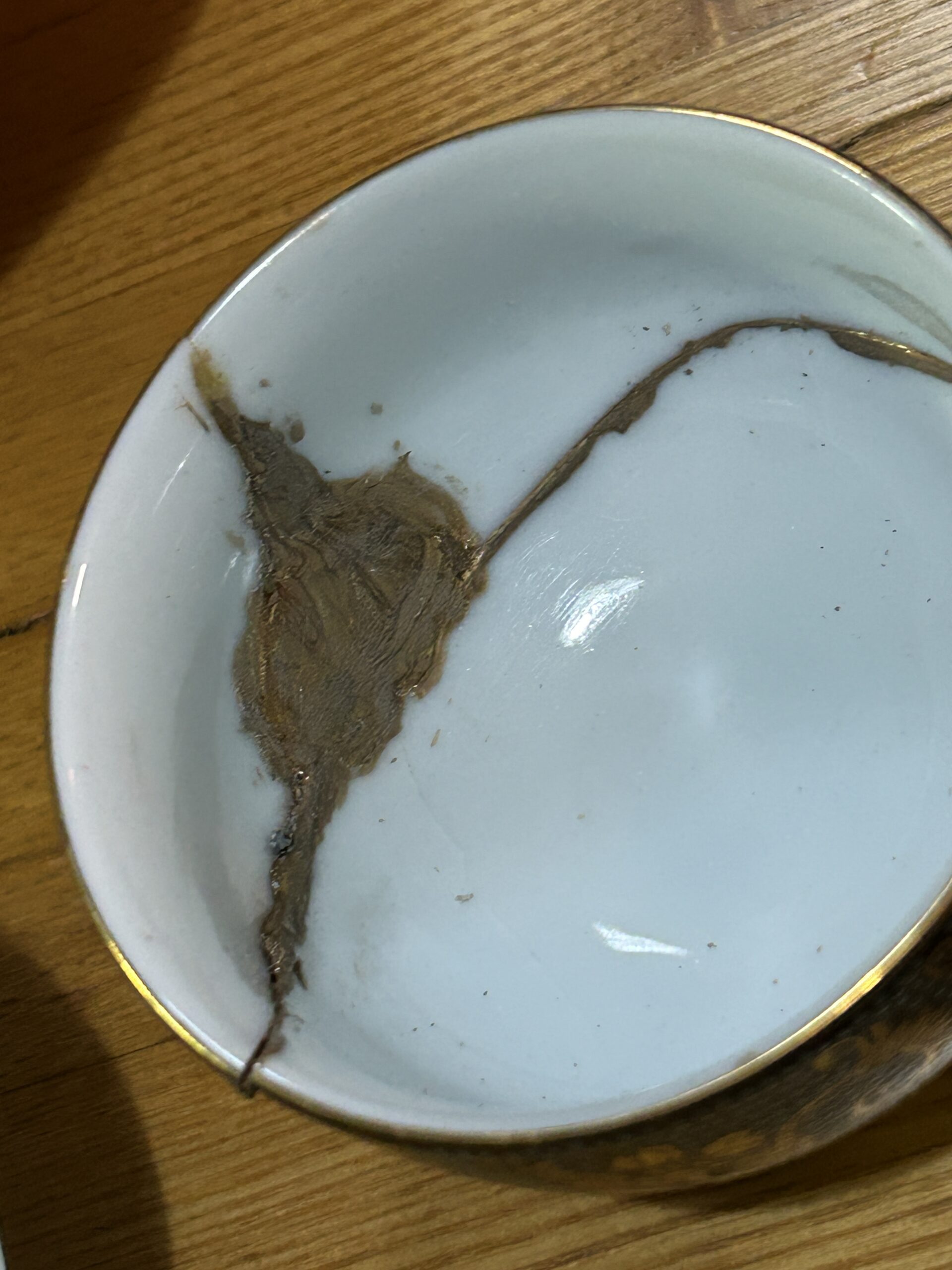 代わりに「まずは接着剤だけで表面を覆い、接着剤が自分で平らに広がるのを少し待ってから、その上に金粉を振りかける」と、以下のような自然にきれいな仕上がり(本来の金継ぎ風ではないけれど)になります。
